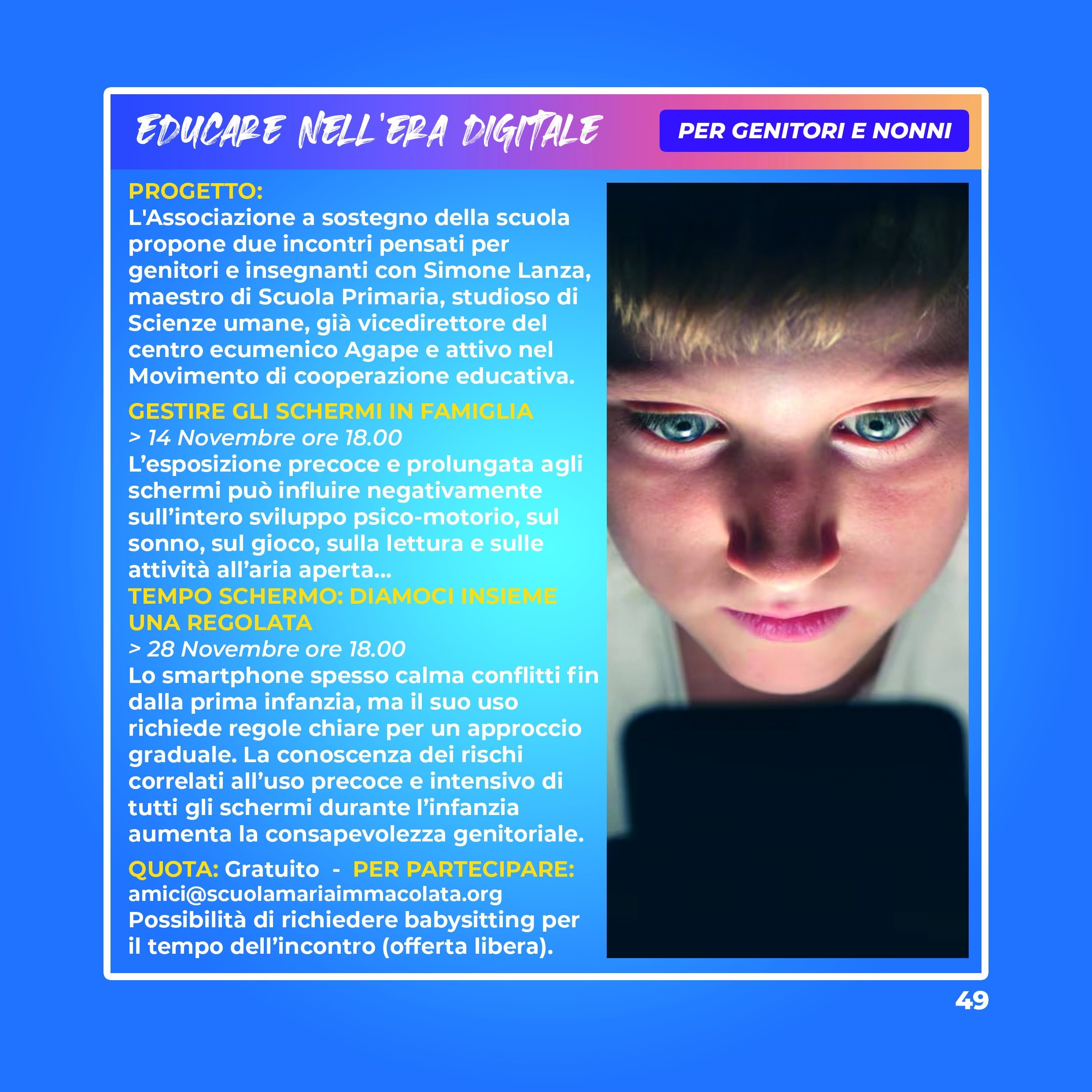 Aspettiamo nel salone della scuola tutti i nonni e – per chi lo desidera – i loro nipoti. I nonni vivranno un momento formativo con un laboratorio a cura della pedagogista Barbara Pessina. I bambini invece saranno accompagnati nelle aule per un momento di gioco. Chiediamo di segnalarci la presenza dei bambini per il servizio di babysitting all'indirizzo amici@scuolamariaimmacolata.org. Se qualche genitore vuole aiutare o vuole stare con i propri bimbi può farlo. Chi lo desidera potrĂ lasciare una offerta per il babysitting che servirĂ a pagare le educatrici.