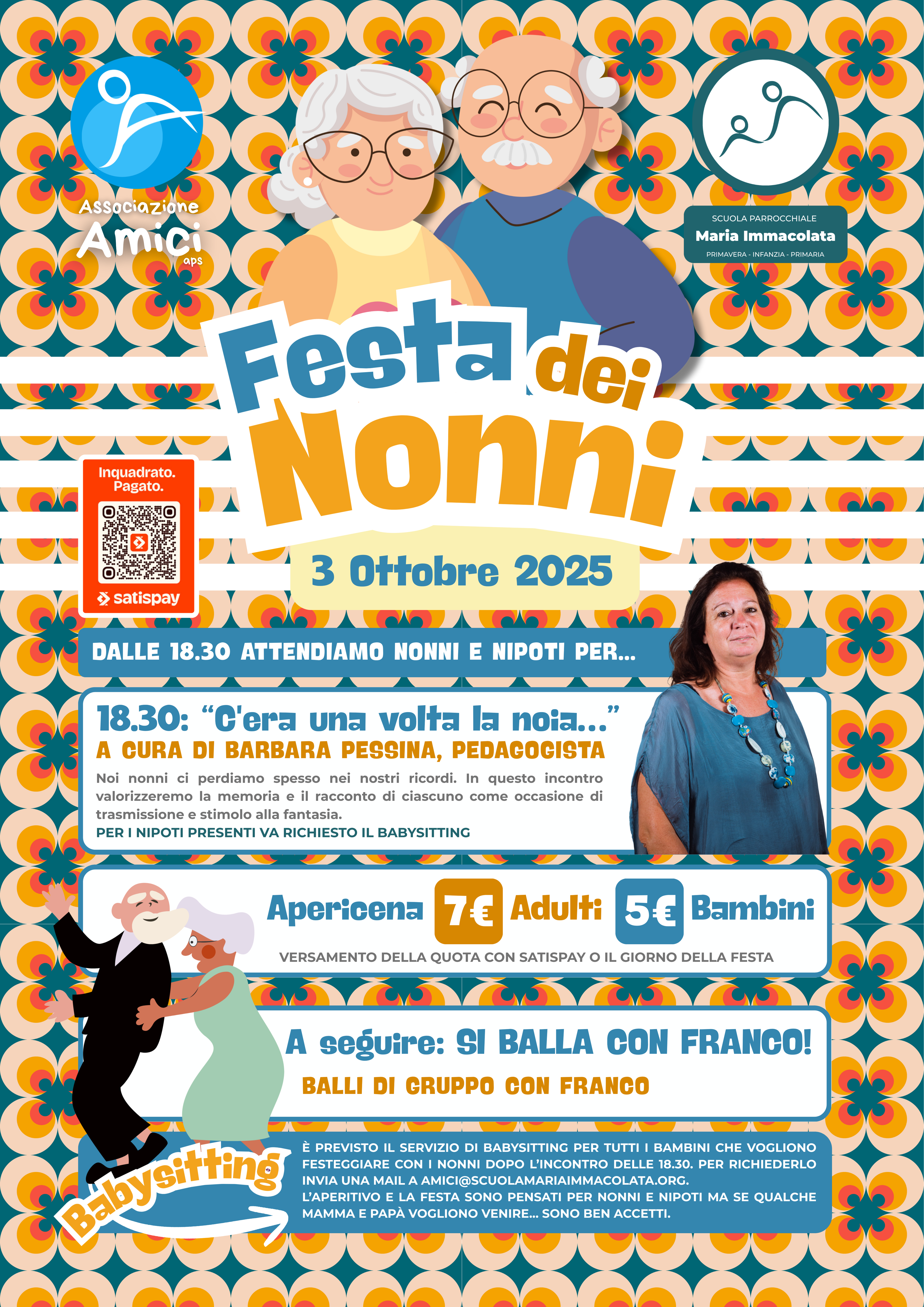 Venerdì 3 Ottobre 2025 l'Associazione a sostegno della scuola, Amici aps, invita tutti i nonni a partecipare alla festa nel salone, in viale Suzzani 64. Sono attesi tutti i nonni, anche quelli dei bambini iscritti nella sede distaccata Santagostino.Â
