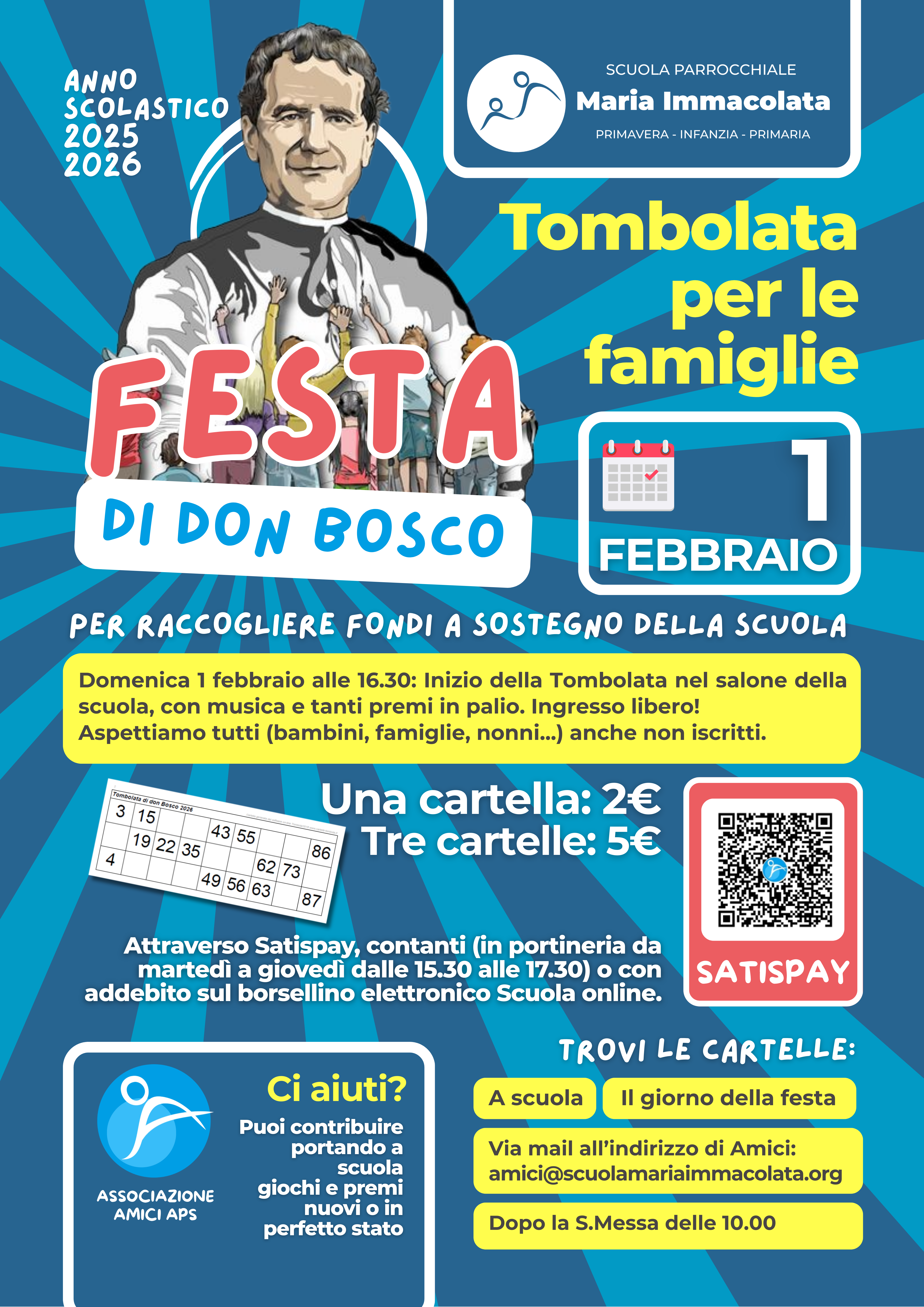 Vuoi aiutarci? Porta in segreteria giochi nuovi o in perfetto stato. Aiutaci nella distribuzione delle cartelle, nella raccolta dei premi o nell’organizzazione della festa. Scrivi a amici@scuolamariammacolata.org o rivolgiti ai soci dell’associazione.